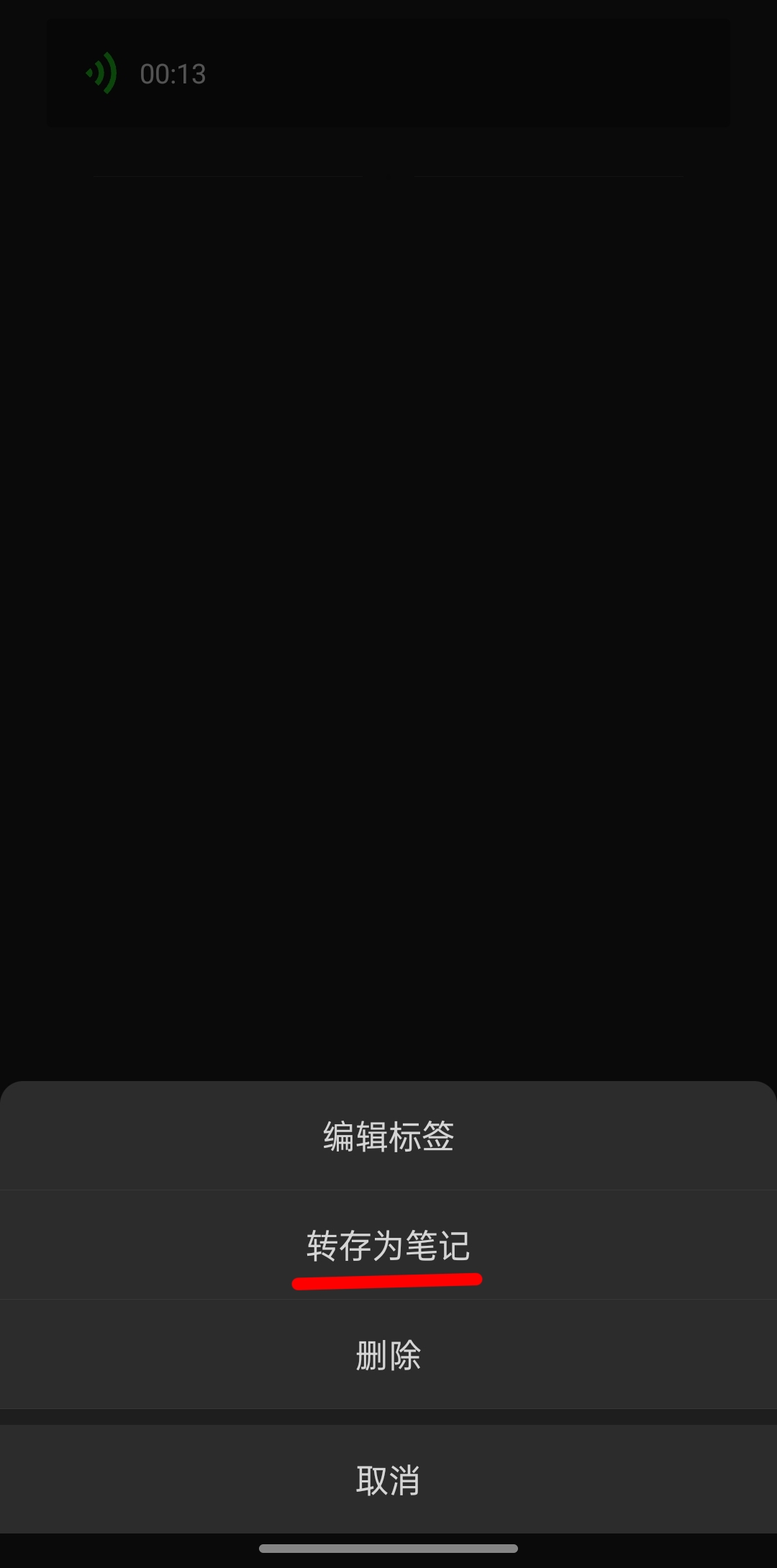 - 在收藏列表里找到收藏的语音,点击界面右上角的三个点,选择转换成笔记